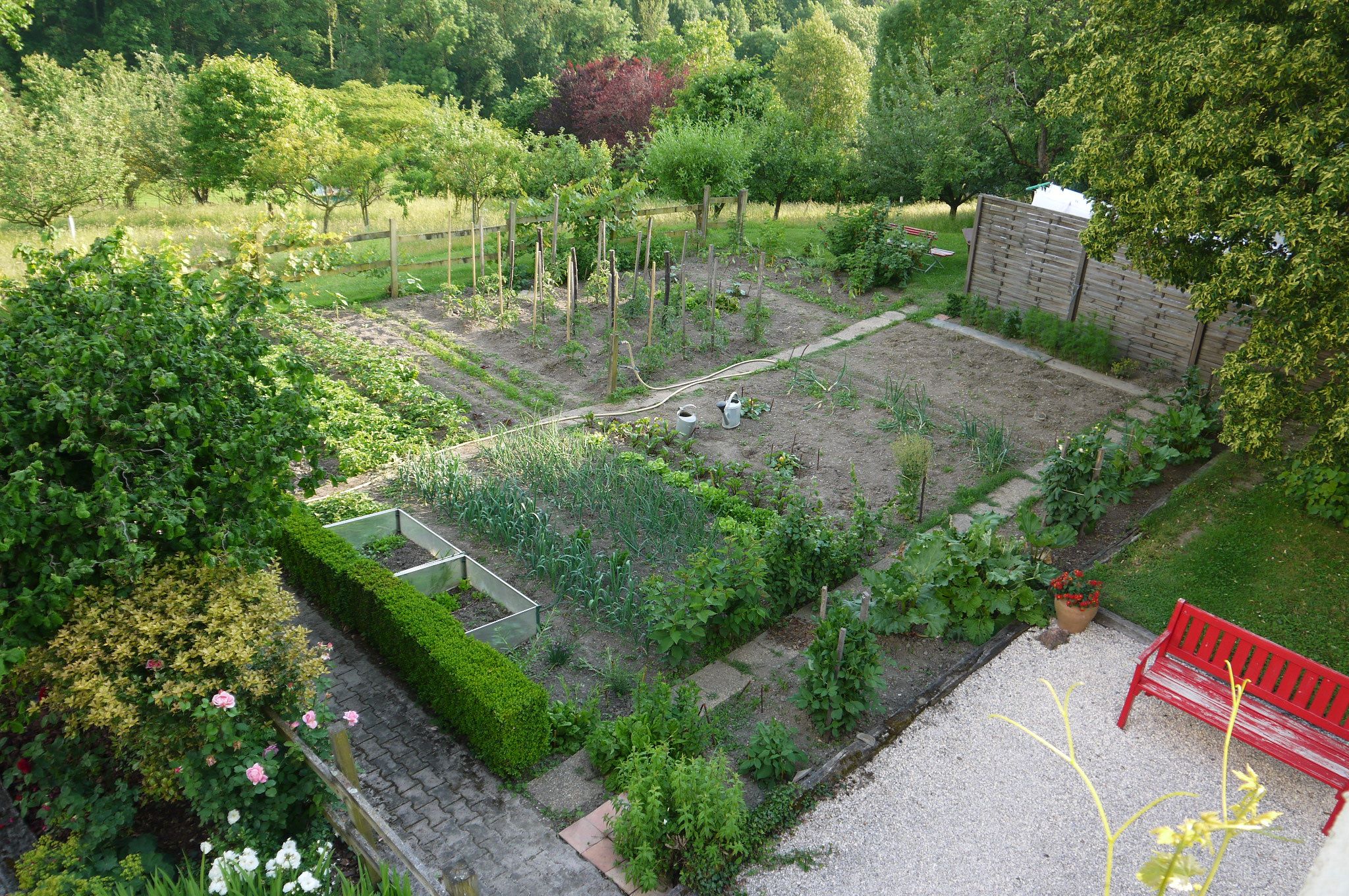 Dans le jardin, vous pourrez vous reposer sur la grande terrasse ombragée par une vigne généreuse. Des coins détente avec fauteuils, bancs ou chaises longues vous attendent sur la pelouse ou à l’ombre des arbres. Vous trouverez aussi un parking privatif dans la propriété, ainsi qu’un abri pour les vélos.